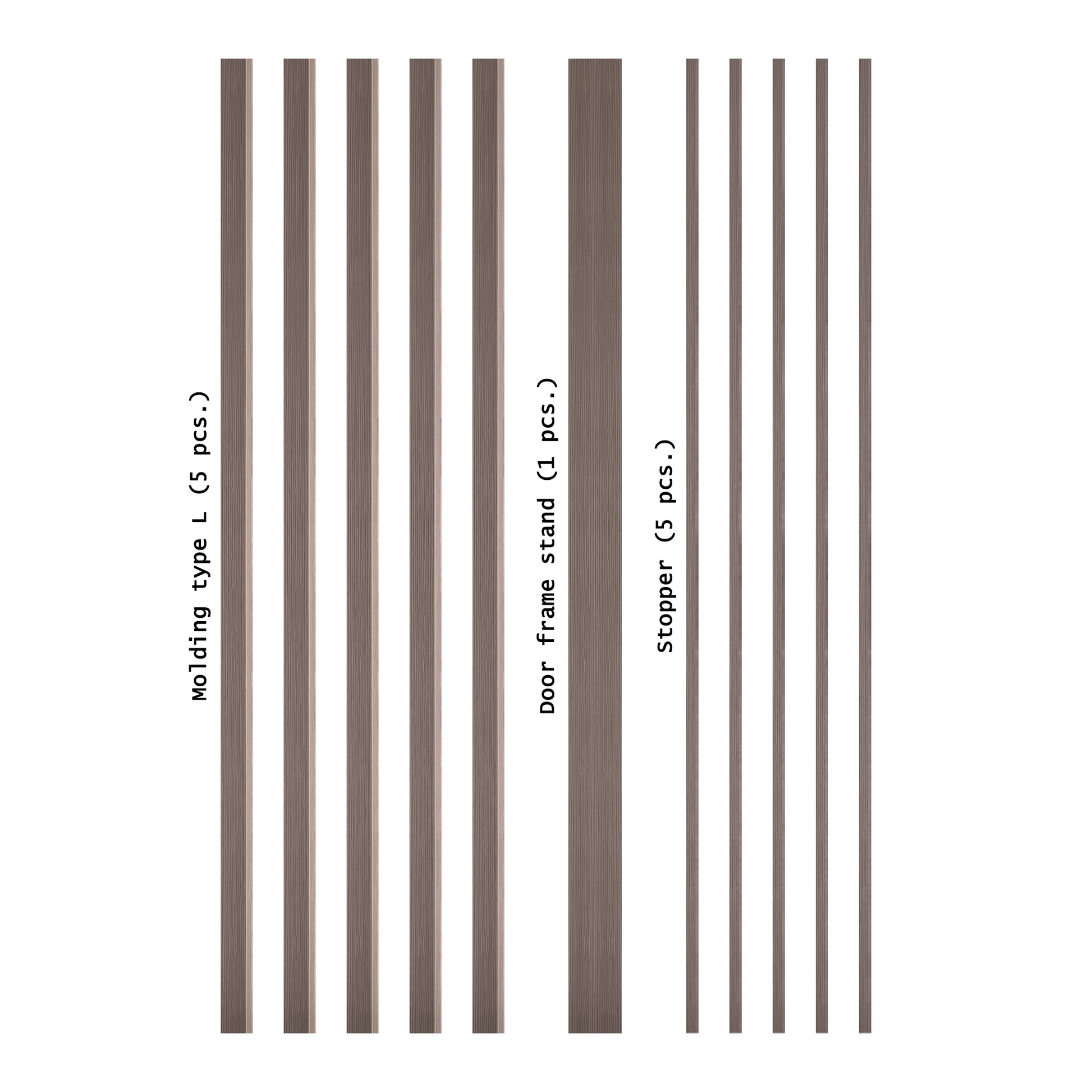 The set | Frame, stopper, hinges | Frame, stopper, hinges, moldings | Frame, moldings | Moldings, decorative elements, finishing strips |